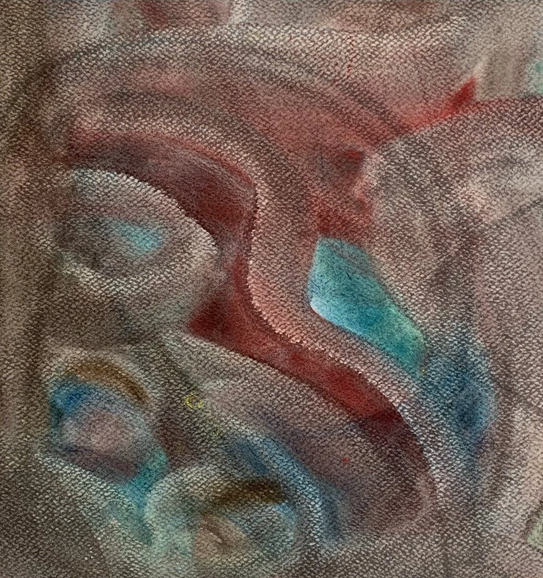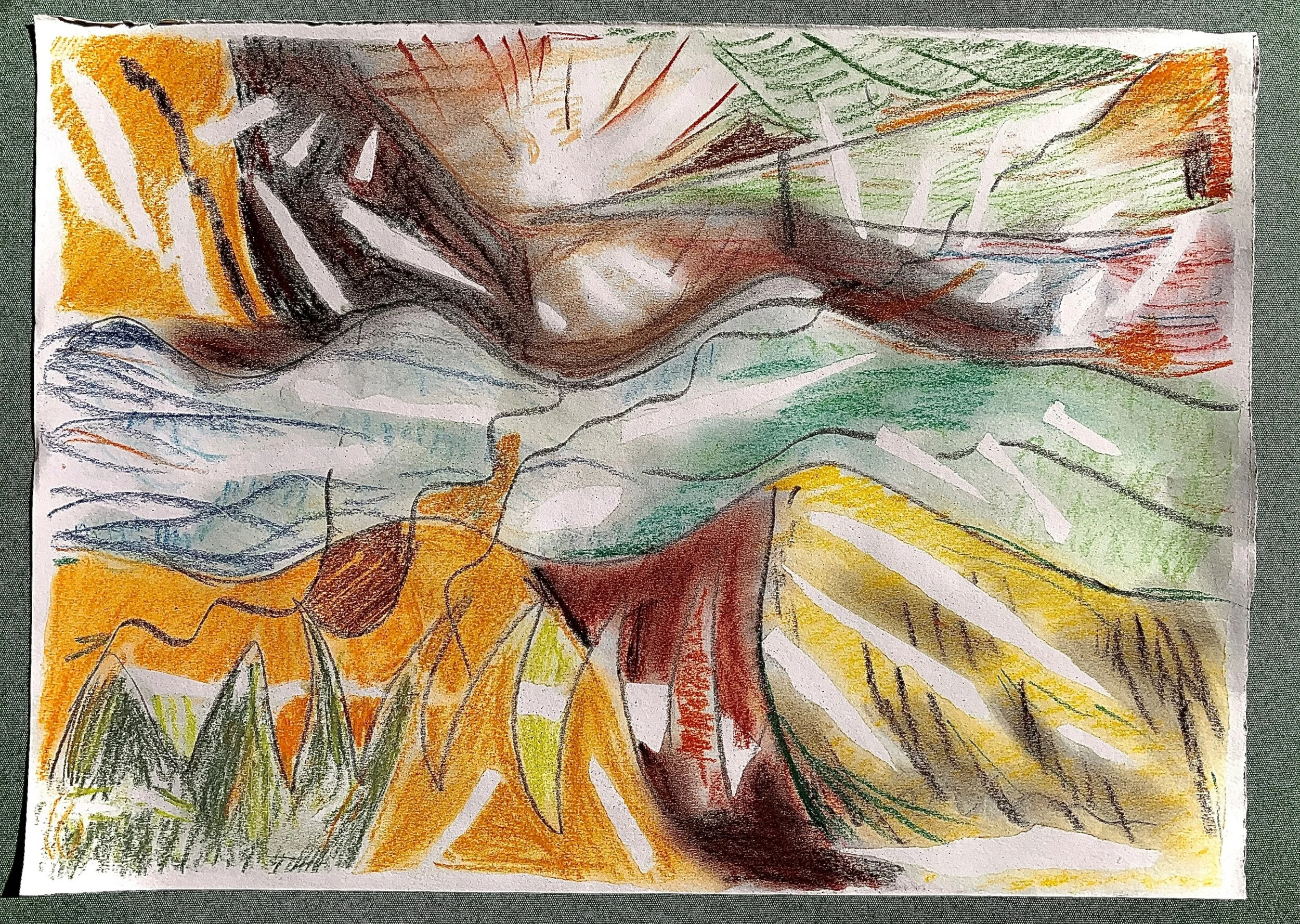 I attached torn strips of masking tape to my paper before drawing in pastel and pencil. Removing the strips revealed white areas and enhanced the movement and light of the drawing.