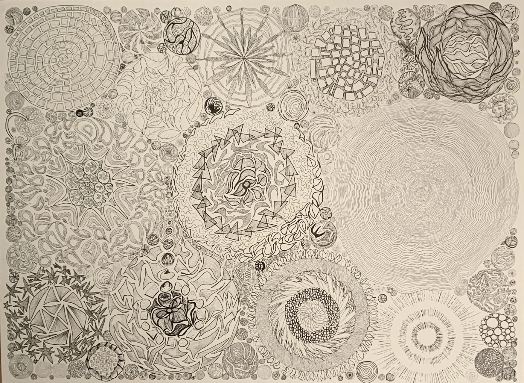 I set myself the challenge of covering the expanse of a sheet of A1 with intricate patterns of ink, following a set of rules. Every pattern should create a circle, but no patterns could be repeated and wherever possible the pen would not be lifted from the paper.