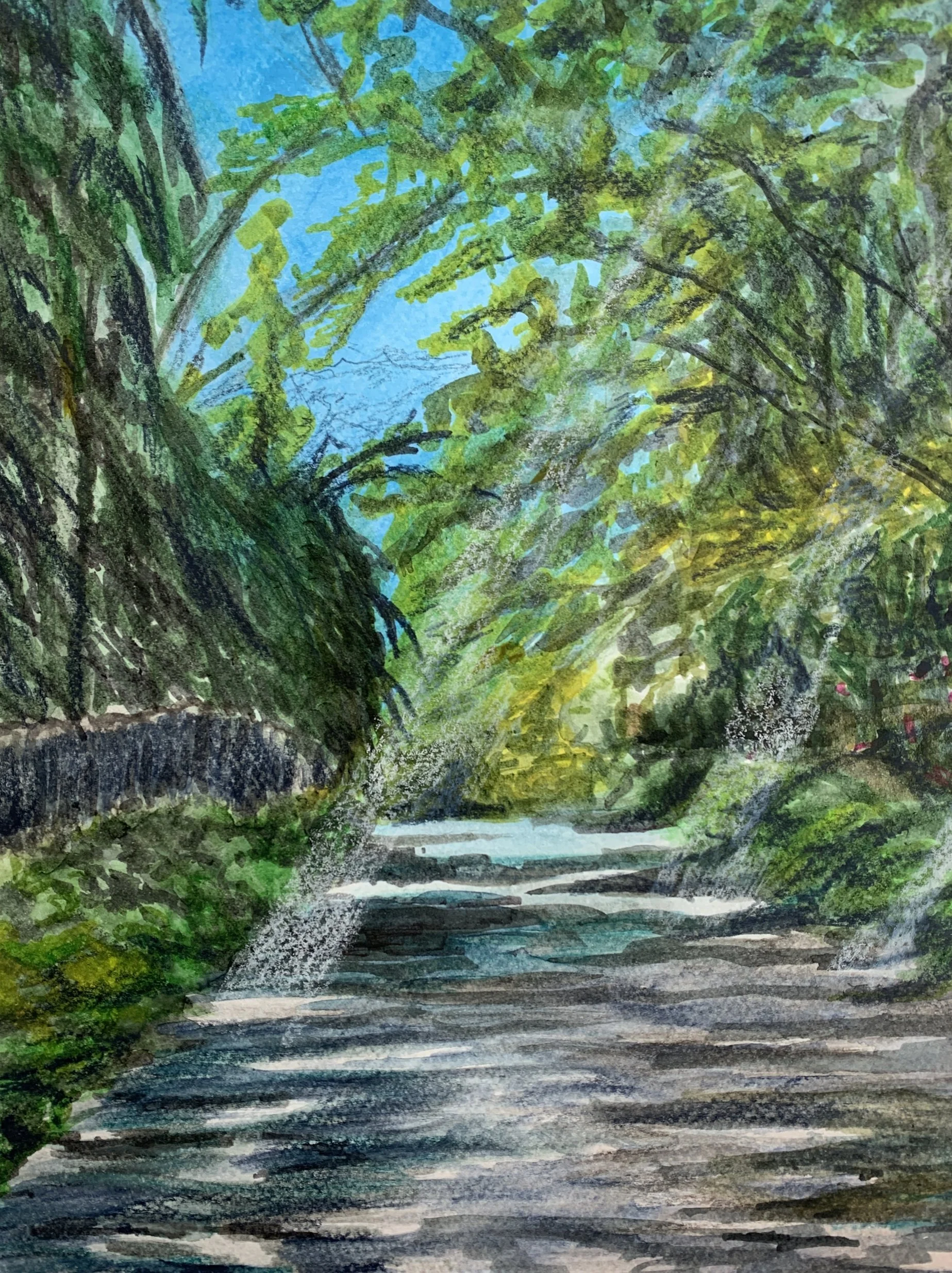 I am fortunate to live in countryside where it is possible to walk for miles without crossing a main road. These paintings were made from pictures and sketches on site.